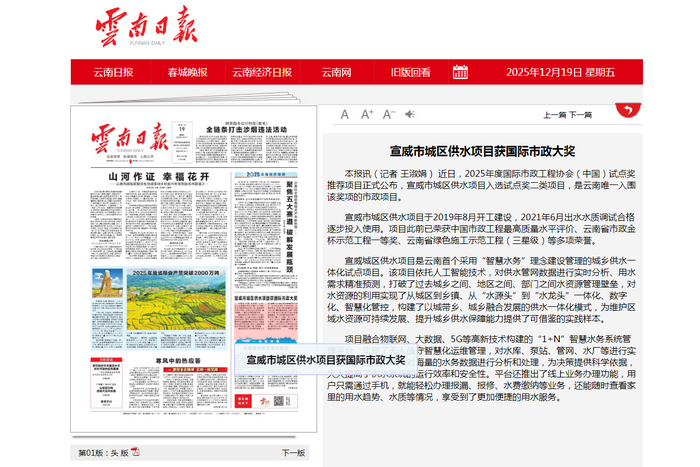 《云南日報》頭版:宣威市城區(qū)供水項目獲國際市政大獎